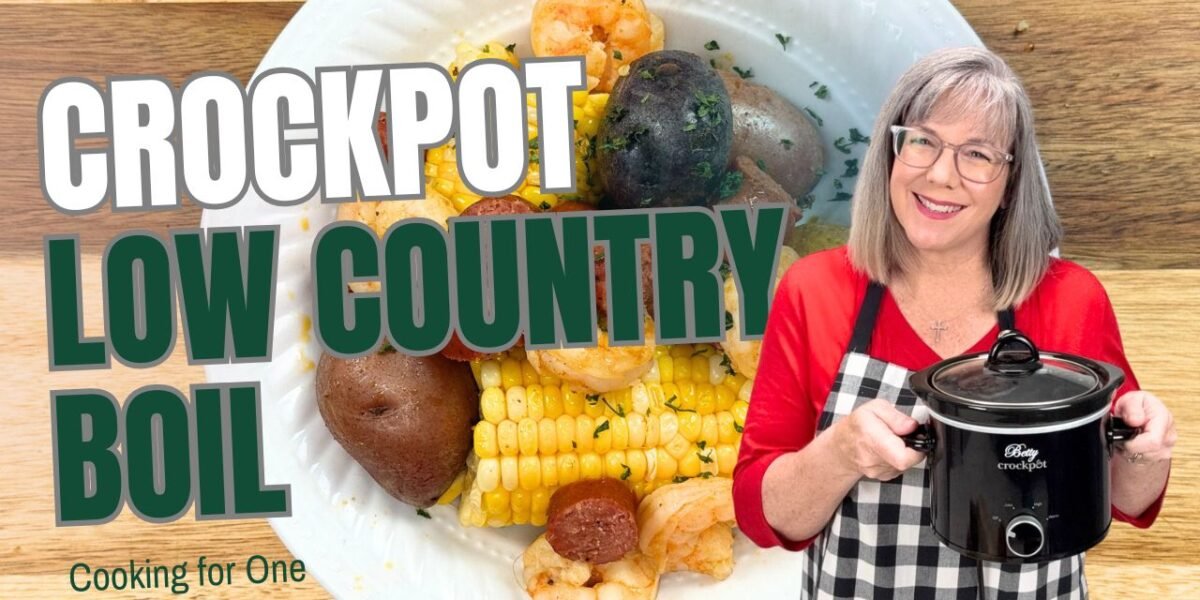 A Low Country Boil includes shrimp, smoked sausage, corn on the cob, and potatoes, all boiled in seasoned broth and served family-style. This version delivers all that flavor and heartiness, but in a small, simple crockpot-friendly batch.